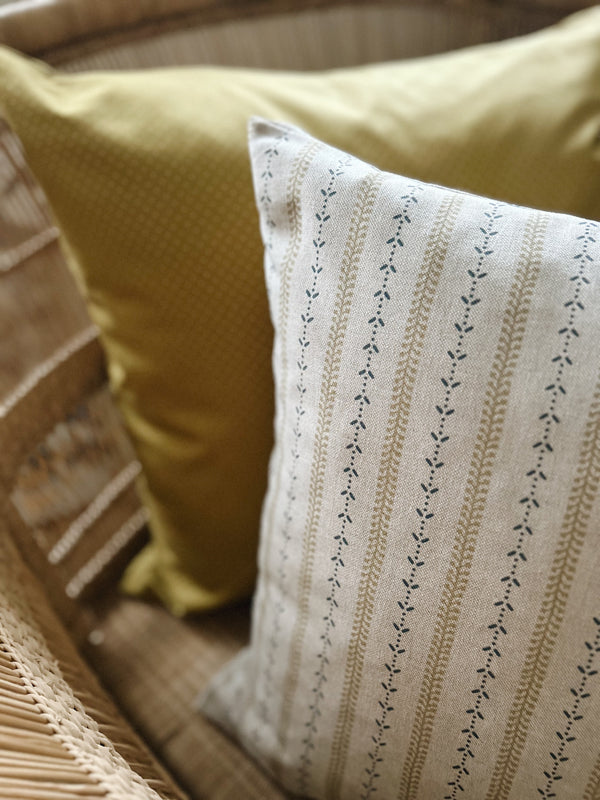Bespoke cushion cover in exclusive quality, made of high-end designer fabric. Soft beige with a regency stripe design in ochre yellow and navy.