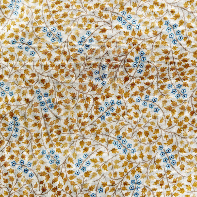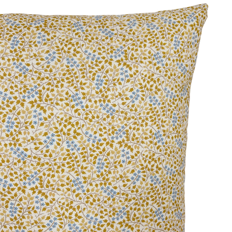Håndsyet pudebetræk i kvalitetsstof syet på lille syværksted i Danmark. Støvet gul og lyseblå.